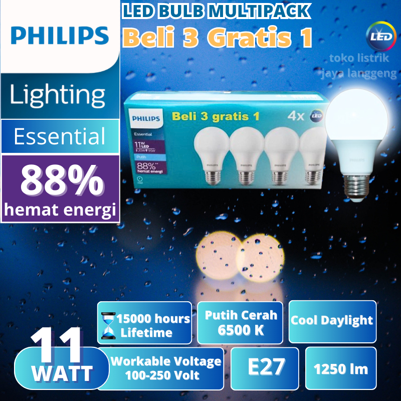Lampu Philips LED Essential 11W Putih Philips 11 Watt Multipack Paket 3+1 Asli Bergaransi