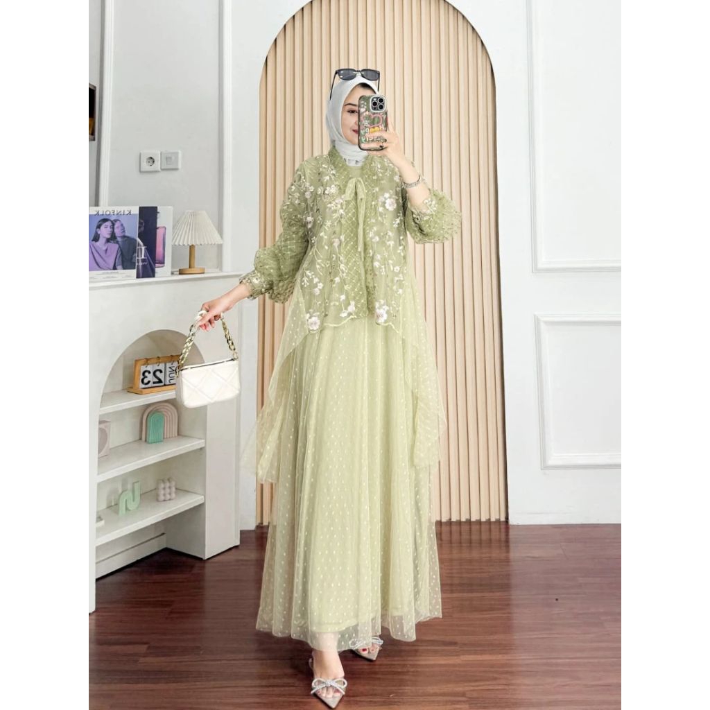 MUTHIA DRESSS GAMIS TRENDY BAHAN JERSEY PREMIUM MIX BRUKAT TILE MEWAH GAMIS LEBARAN TERBARU 2026