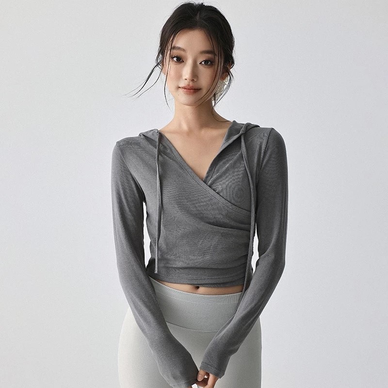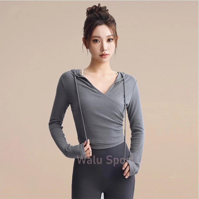 Baju olahraga wanita lengan panjang V-neck dengan hoodie, cocok untuk lari dan yoga.