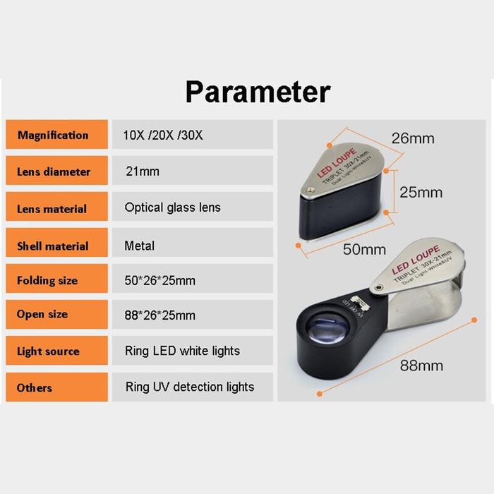 Triplet 30x-21mm AB90 / LED Loupe / Lup Kaca Pembesar Lipat Perhiasan Batuan Geologi Lensa