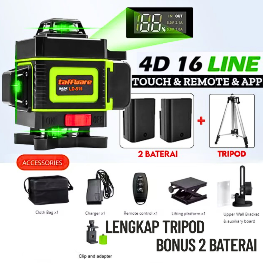 MALL HILDA Laser Level 4D 16 Line LCD komplit bonus 2 baterai + tripod tukang bangunan Leveling
