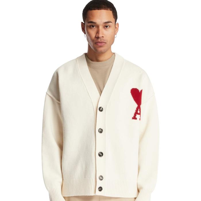 AMI CARDIGAN CLASSIC FIT WOOL V NECK BIG LOGO UNI HEATHER WHITE - S