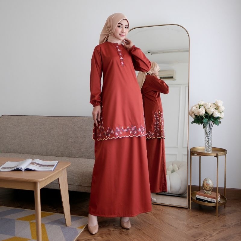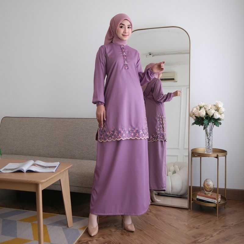 Elvrist - One Set Dhanya Kurung Melayu Katun Toyobo Bordir Kembang Bunga Mawar Strimin Stelan