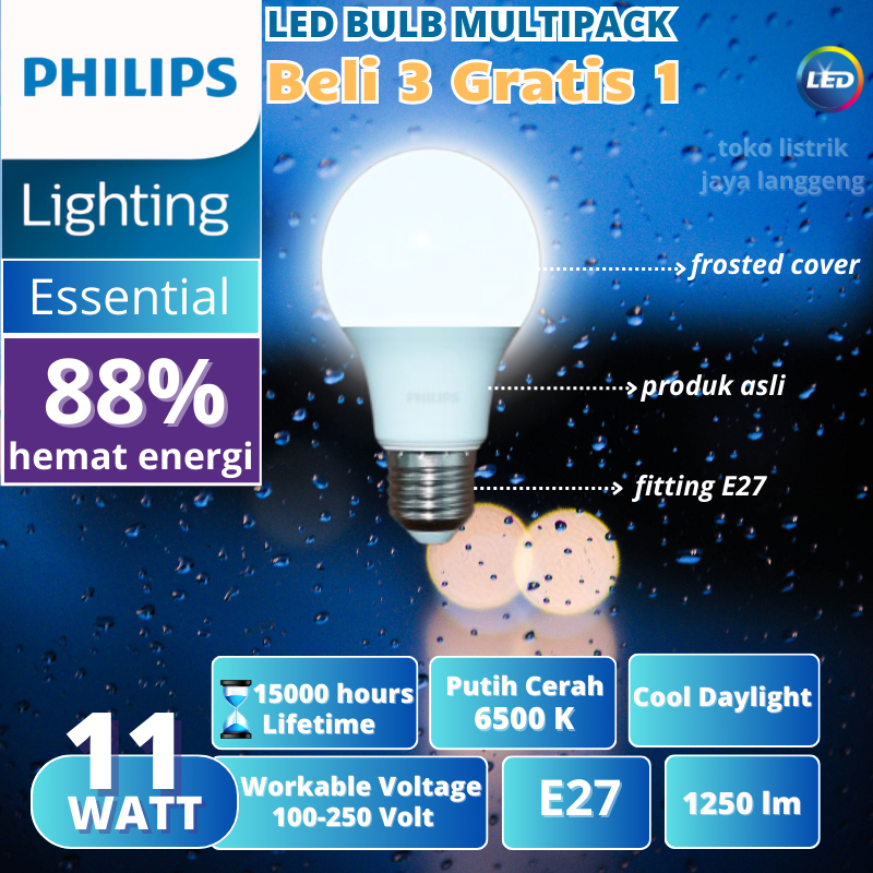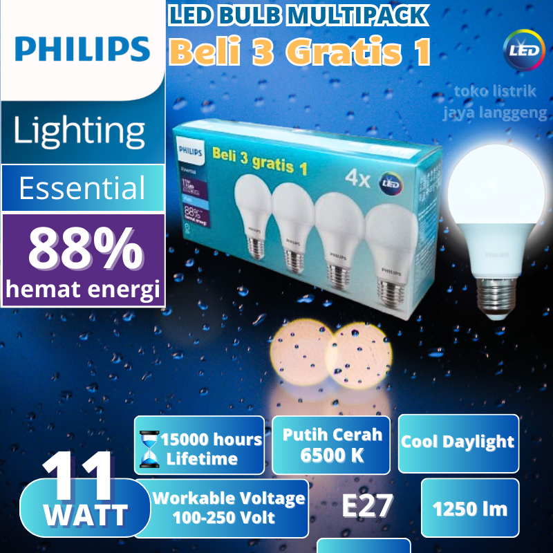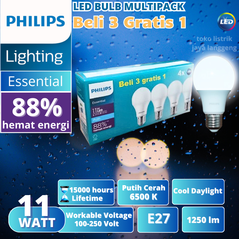 Lampu Philips LED Essential 11W Putih Philips 11 Watt Multipack Paket 3+1 Asli Bergaransi