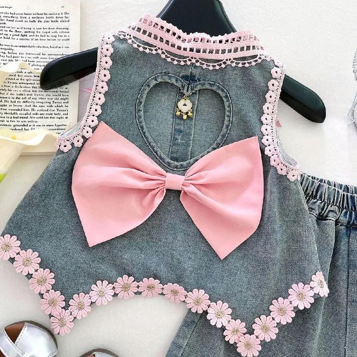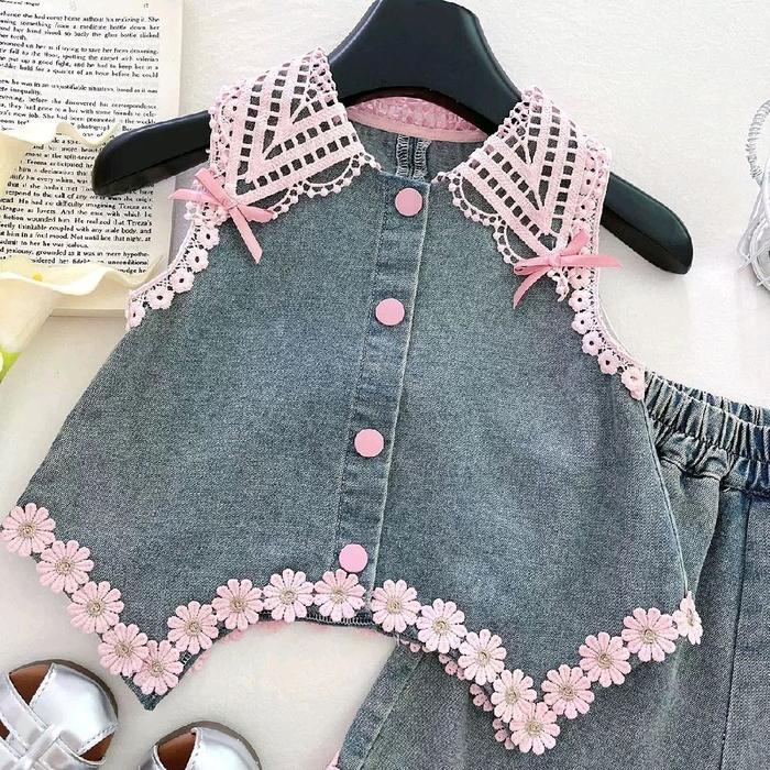 [CELYNE_LABEL] C30464 BAJU SETELAN ANAK PEREMPUAN DENGAN RENDA BUNGA DAN DETAIL KANCING CANTIK JEANS - 90