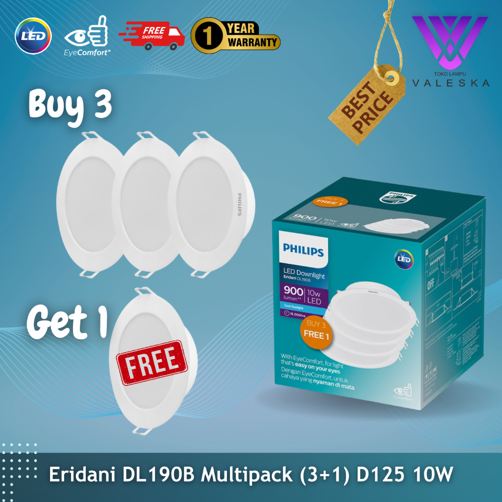 10W Philips Lampu LED Downlight Multipack Beli 3 Gratis 1 D125 65K Cahaya Putih