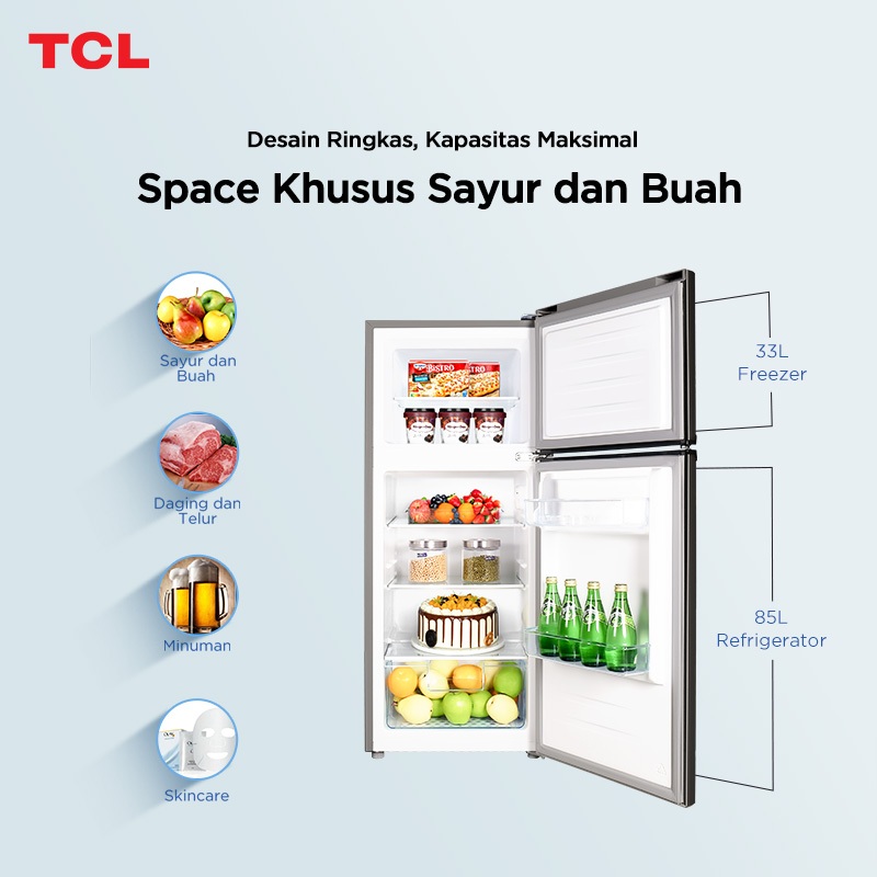 TCL Kulkas 2 Pintu (F130-A50) - Kapasitas 118L - Rak Freezer Terpisah - 3D Surround Cooling - Adjustable shelves - Low N