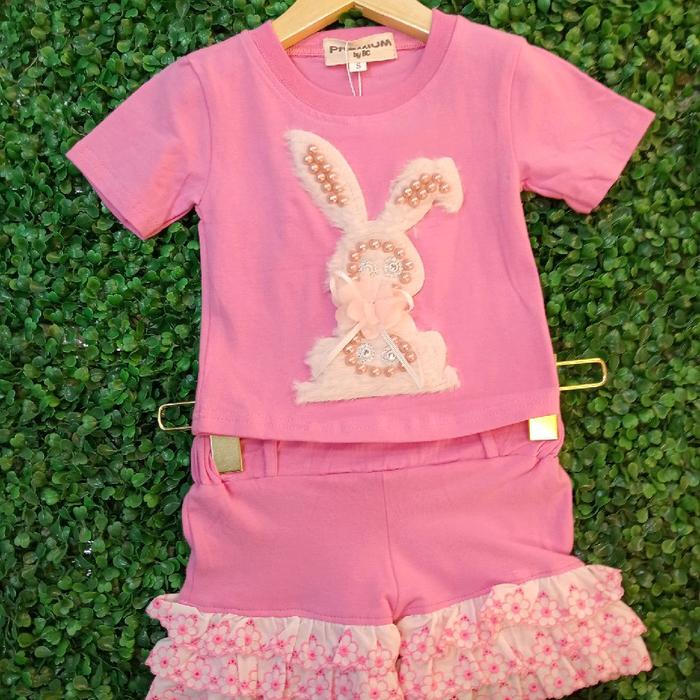 PREMIUM BABY SETELAN ANAK PEREMPUAN WARNA PINK DENGAN MOTIF KELINCI DAN ROK BERENDA CANTIK