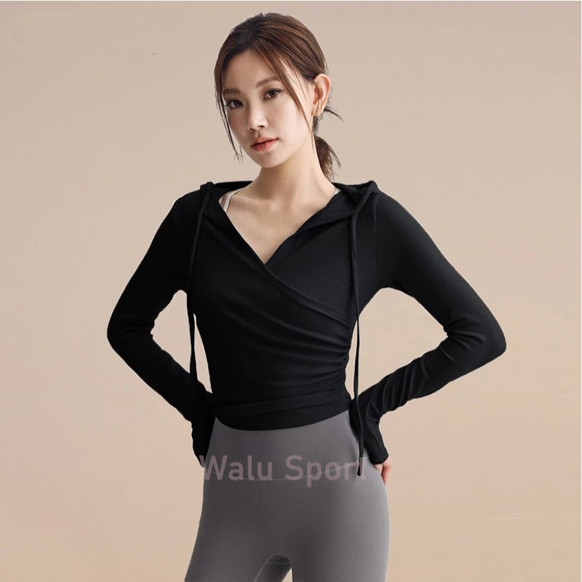 Baju olahraga wanita lengan panjang V-neck dengan hoodie, cocok untuk lari dan yoga.