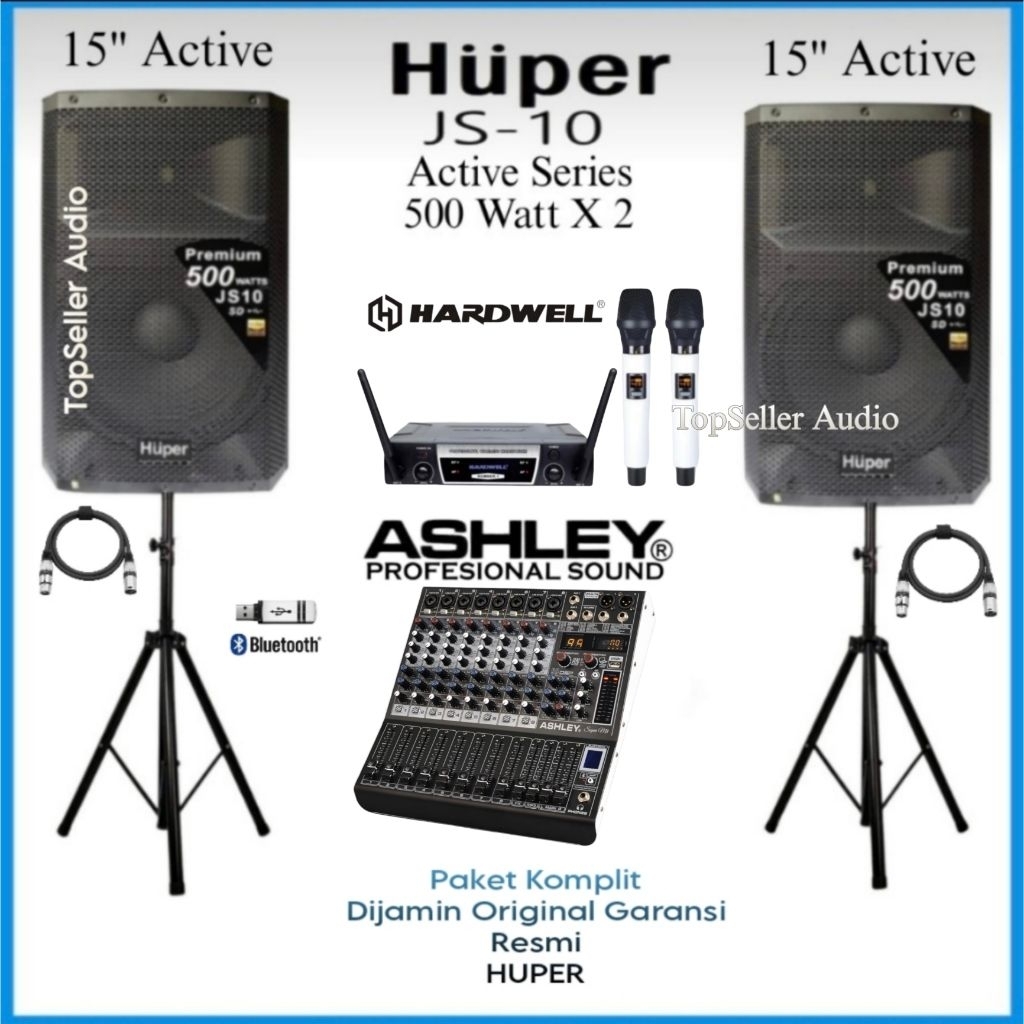 Paket Sound System Speaker Aktif Huper JS10 15 Inch Mixer Ashley Super M8 Bluetooth Mic 2 Wireless Hardwell Original Garansi Resmi