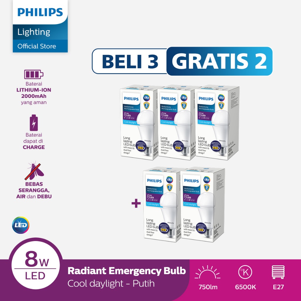 Beli 3 Gratis 2 Philips Lampu LEDBulb Bohlam Radiantline Bohlam Emergency 8W 6500k Putih