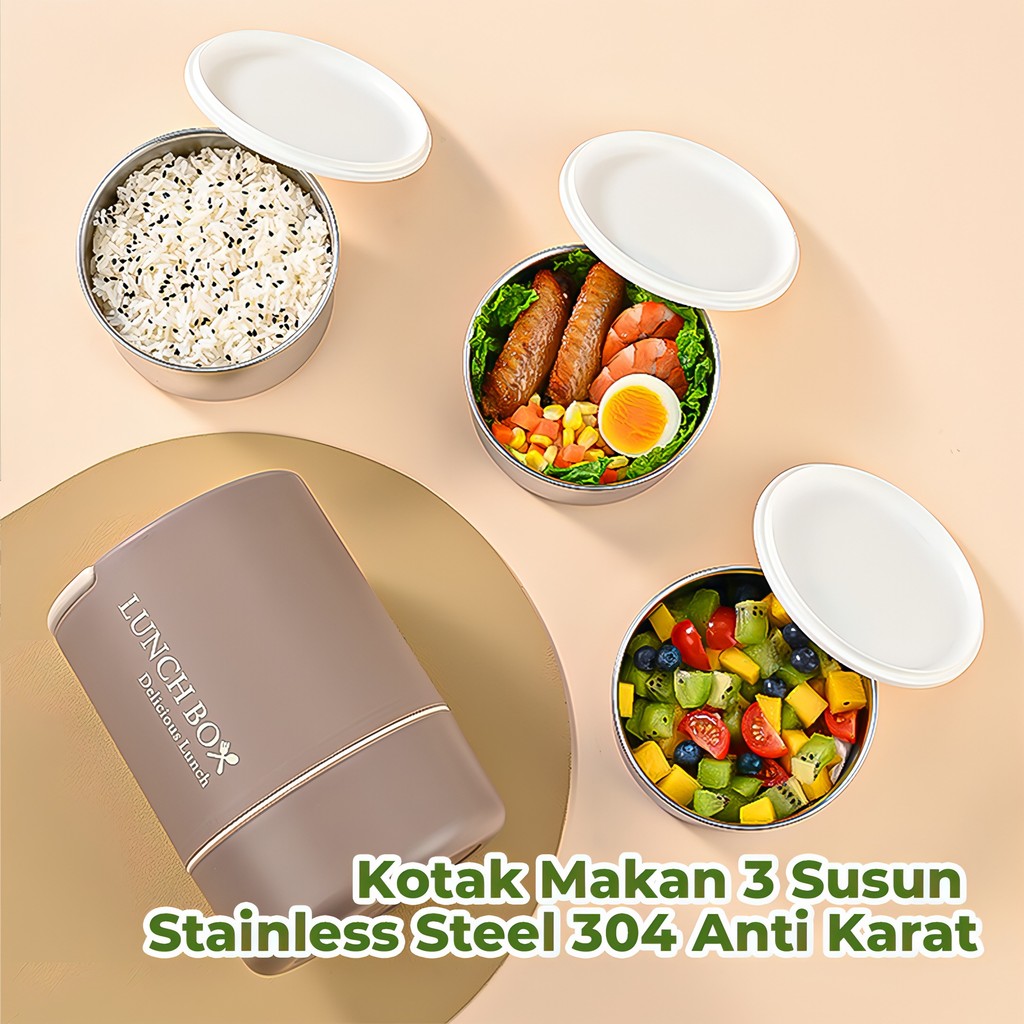 Heefn Lunch Box Stainless 3 Susun Kotak Makan Tempat Makan Kotak Bekal Anti Tumpah