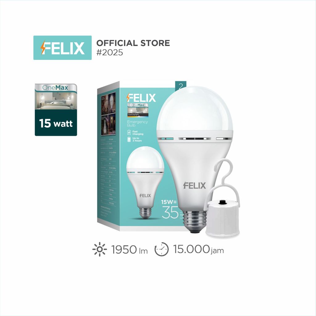 FELIX ONEMAX LED Lampu Emergency 15W Putih Super Terang Hemat 90 PERSEN E27 Setara 195W Garansi 2 Tahun
