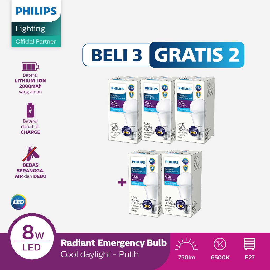 Beli 3 Gratis 2 Philips Lampu Radiantline Emergency LEDBulb 8W 6500K Putih
