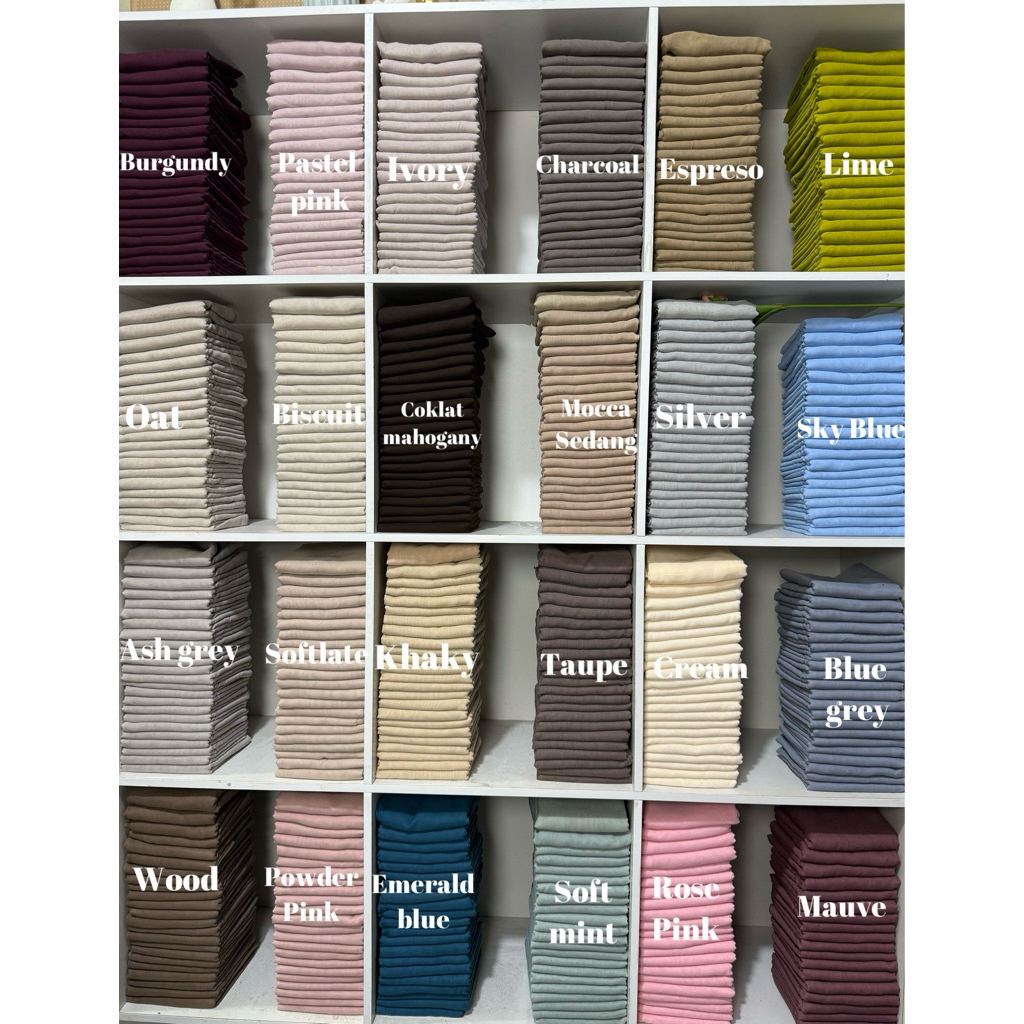 Hitam, Maroon, Navy, Putih, Biscuit, Ivory, Espresso, Ash Taupe, Major, iron, Tortila, Charcoal, Taupe, Softlate, Milo, Alter, Khaky, Coffelate, Sand, Coksu, Wood, Milky, Crimsom, Cream, Dark khaky, Mocca sedang, Deep army, Ash grey, Sage, iced Blue, Powder pink, Fusia, Yellow, Sky Blue, Army, Mocca muda, Dark maroon, Bw, Soft Blue, Sage green, Denim, Dusty Purple, Orchid, Rose berry, Silver, Stone grey, Soft mint, Taro, Oat, Rose pink