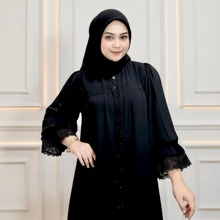 ABAYA ELISHA - GAMIS ABAYA LENGAN BALON DENGAN RENDA ELEGAN DAN PAYET BERKILAU BAHAN JETBLACK KUALITAS TINGGI NYAMAN UNTUK PENAMPILAN MEWAH - BLACK, STANDAR LD: 110