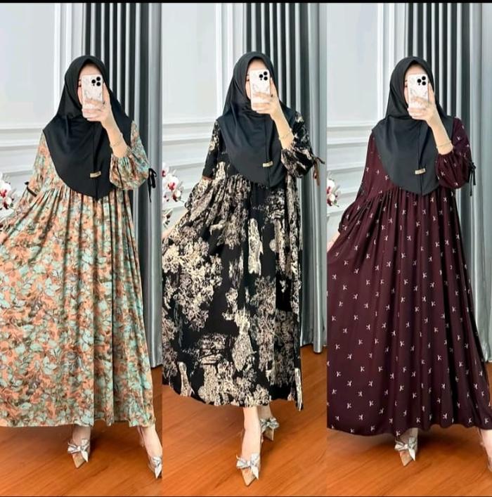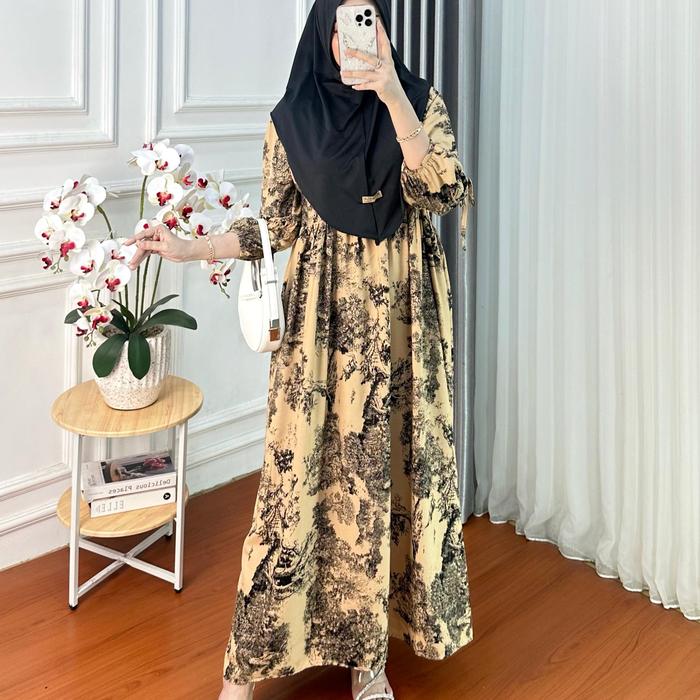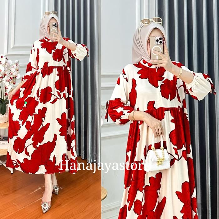 MIDDI DRESS PITA LENGAN BALON BAHAN RAYON DIAM0ND BUNGA CANTIK - DIAM0ND HITAM