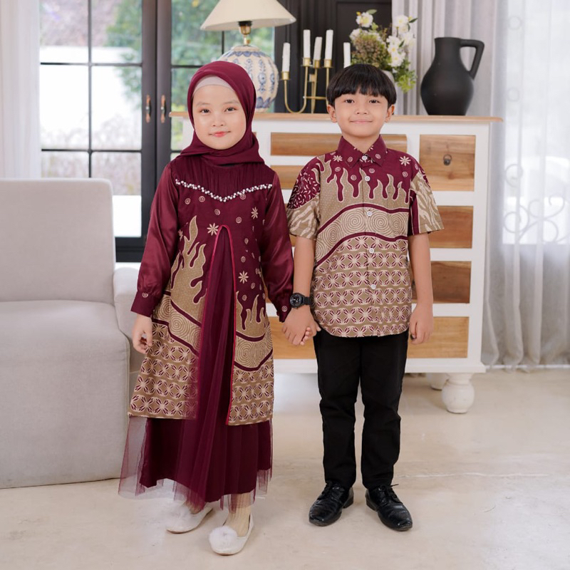 Batikrmstore - Rahayu Burgundy Baju Couple SARIMBIT Keluarga Couple Family Set Rahayu Couple Lebaran