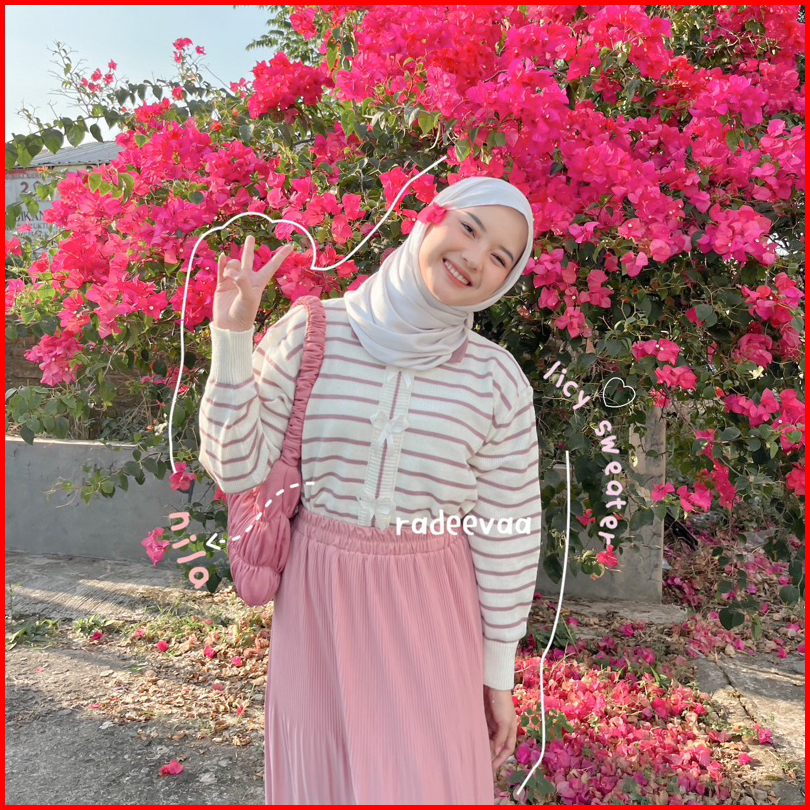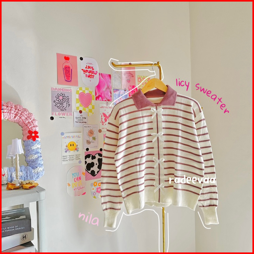 Licy Sweater Coquette Ribbon Stripe Knit Atasan Rajut Pita Motif Garis Wanita Korean Style