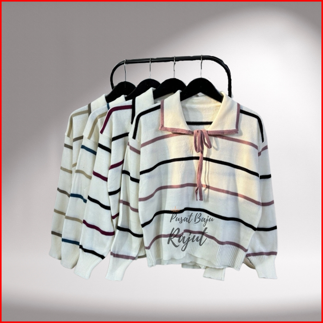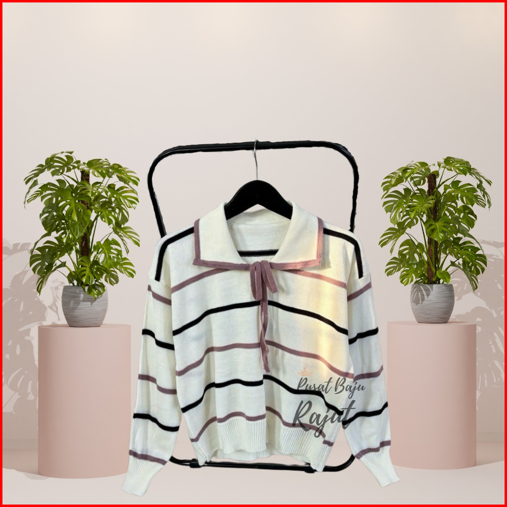 Sweater Rajut Berkerah Polo Pita Atasan Wanita Motif Garis