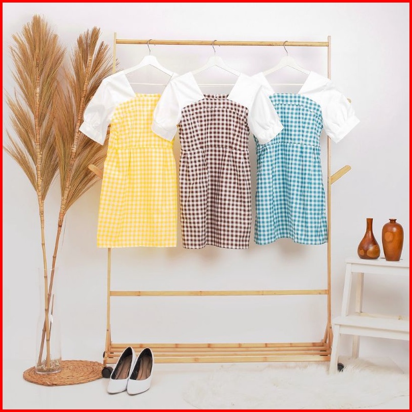 Dress Two Tone Combi Kotak Lengan Puff Kemeja Kombinasi Mini Dress Motif Catur Chess Summer Dress Gaun Santai