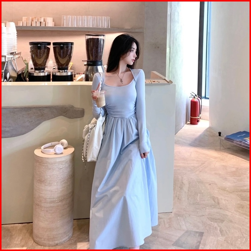 Dress Korea Dress Biru Muda Dress Midi Premium Murah Terbaru Dress Lengan Panjang Dress Kasual Leher U Dress Panjang Dre