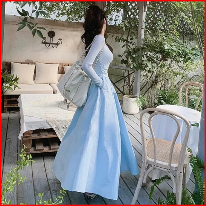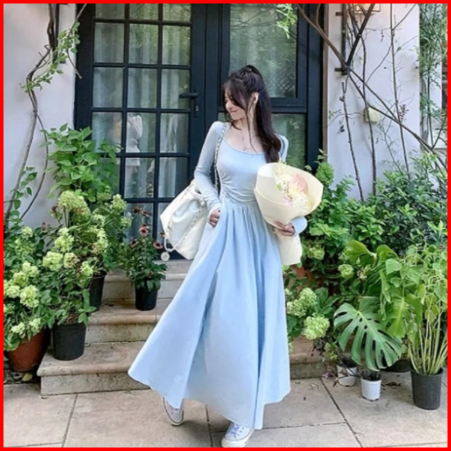 Gaun Korea Gaun Panjang Gaun Pantai Gaun Biru Muda Gaun Panjang Wanita Gaun Elegan Wanita Lengan Panjang Gaun Pinggang P
