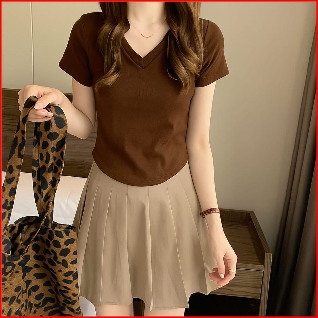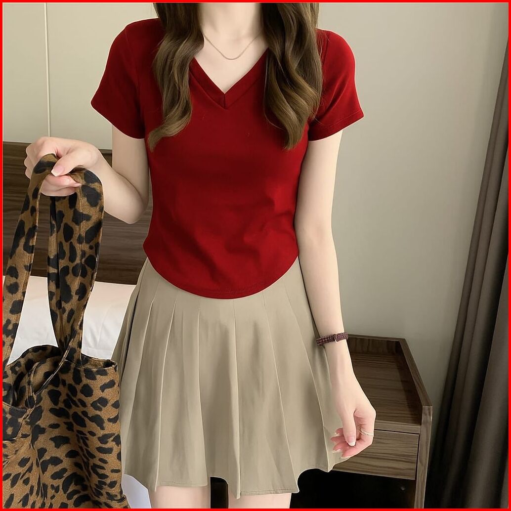 Kaos V-neck Basic Crop Top Short Sleeve T-shirt Terbaru Bahan Spandeks Lembut Dan Adem