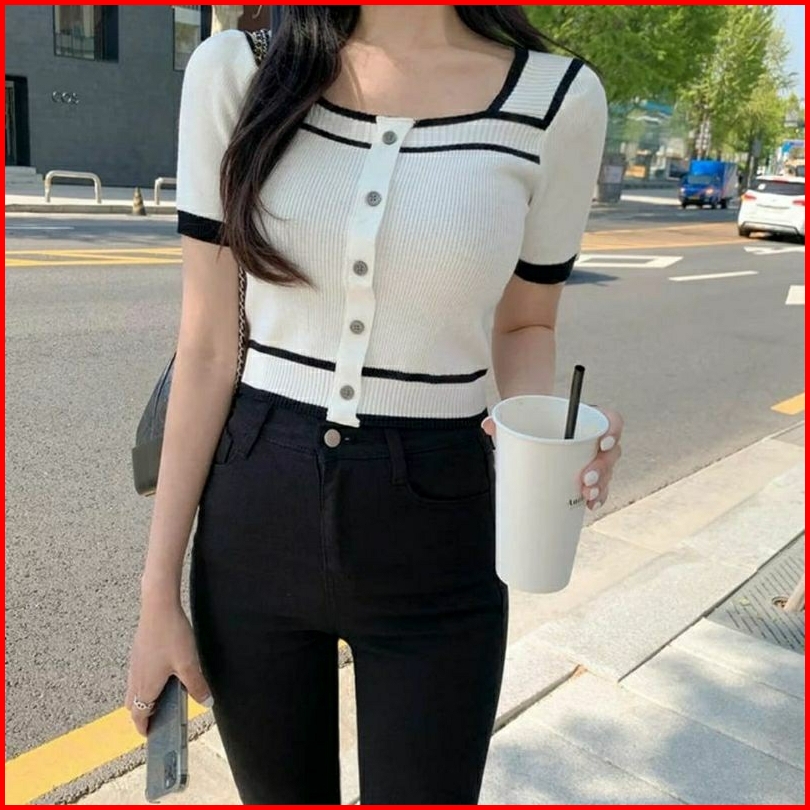 Atasan Rajut Wanita Square Neck Kancing