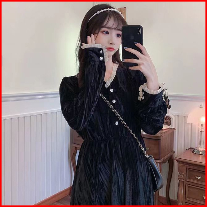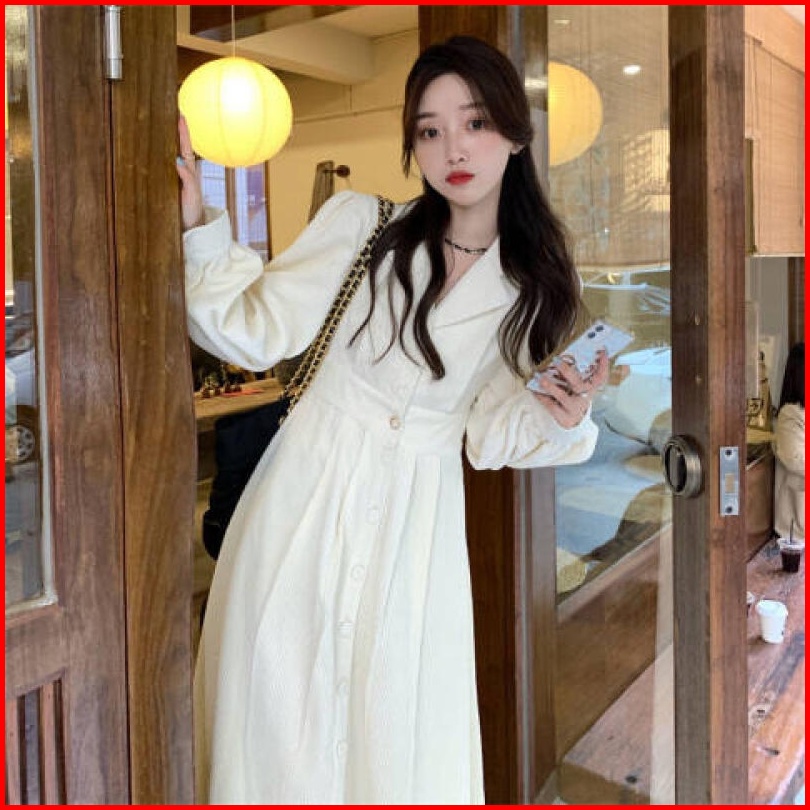 Dress Korean Style Kerah Setelan Pinggang Retro Elegan Lengan Panjang Korduroi Terbaru Rok Midi