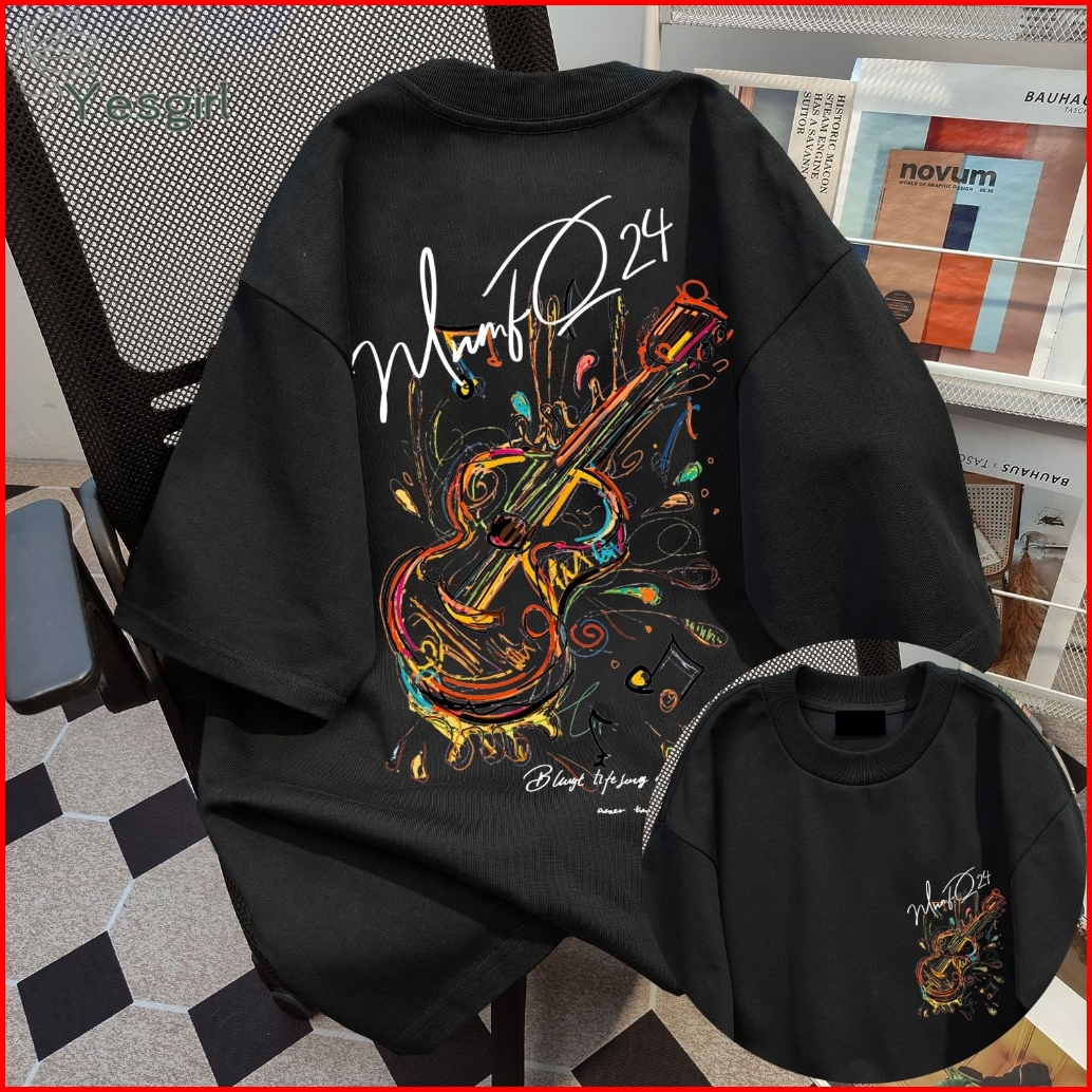 Yesgirl Korea Style Gitar Warna-warni Print Kaos Kasual Longgar Atasan Wanita Kekinian Kaos Oversized Baju Atasan Wanita