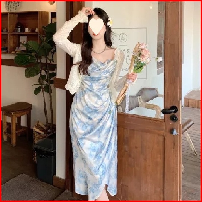 Dress Pesta Blue Summer Korean Flowery Dress Dress Dinner Blue Long Dress Sexy Long Dress Dress Biru
