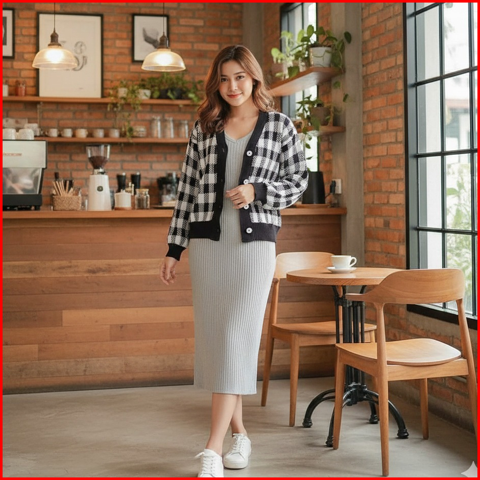 Katty Cardy Cardigan Rajut Wanita Cardigan Kotak Kotal Terbaru Kekinian Rajut Motif Kotak- Kotak Korea
