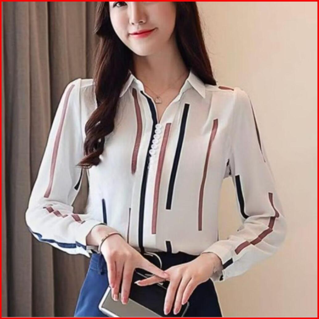 Baju Atasan Wanita Terbaru Kemeja Wanita Blouse Korean Style Atasan Wanita Kekinian Lengan Panjang Motif Salur