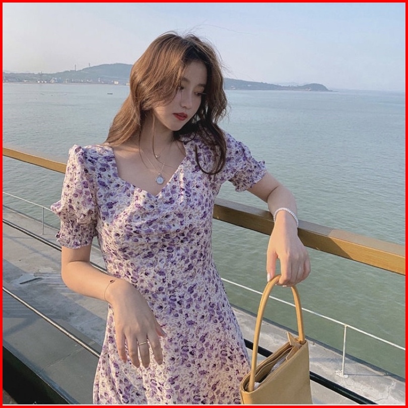 D111 - Lavender Midi Dress Korean Vintage Dress Gaun Wanita Murah Motif Bunga Bergaya Korea Kekinian Import
