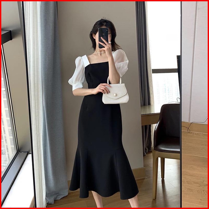 Basic Id Fashion Dres Wanita Lengan Pendek Kombinasi Gaun Wanita Elegant Dres Wanita Pesta Korean