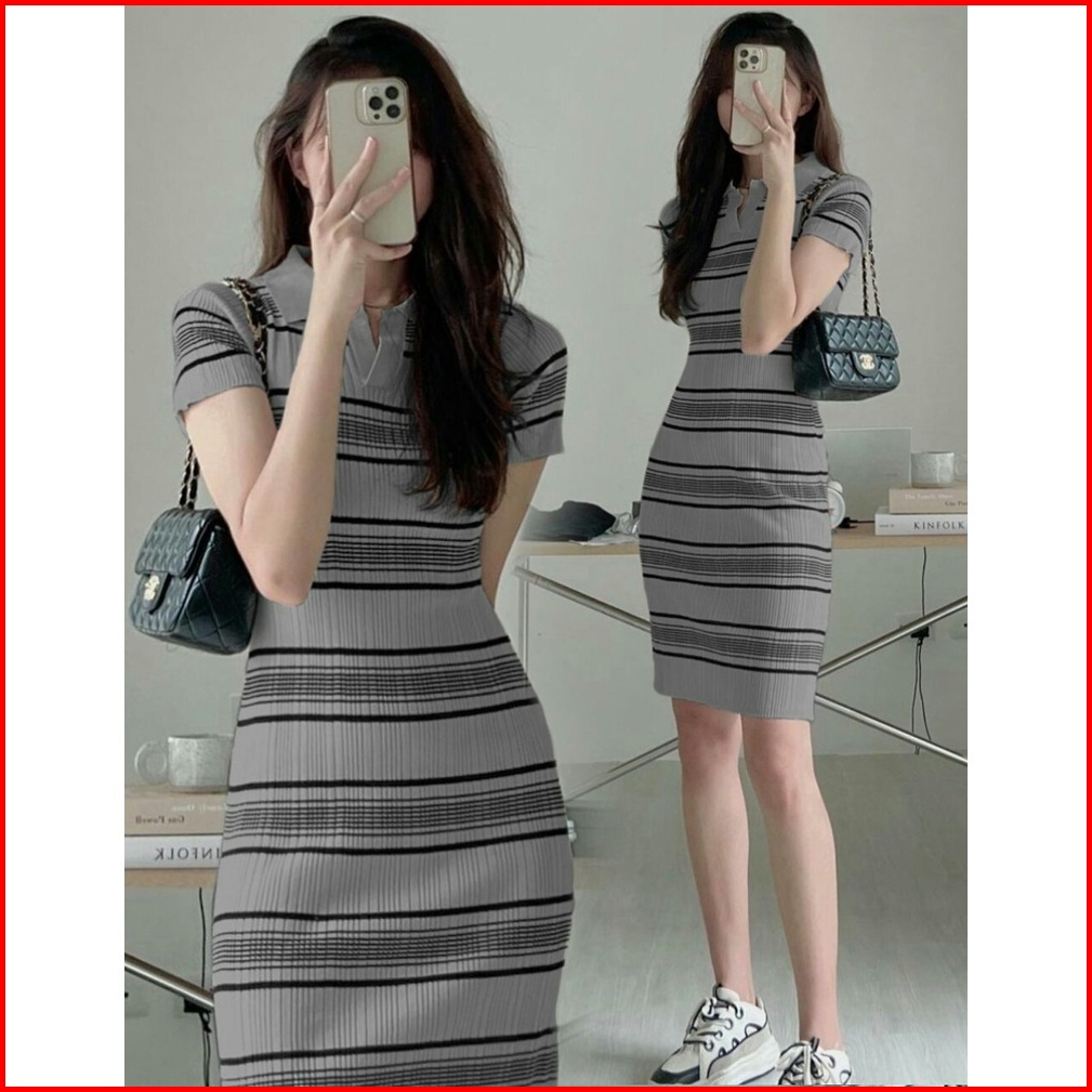 Dress Rajut Lisaai Kerah Polo Salur Garis-garis
