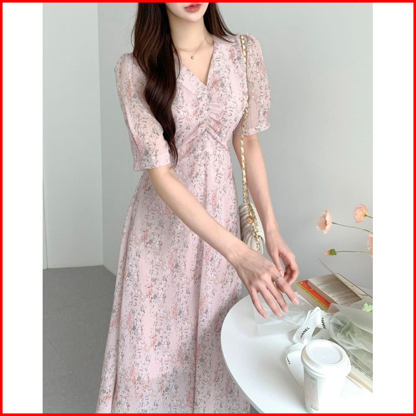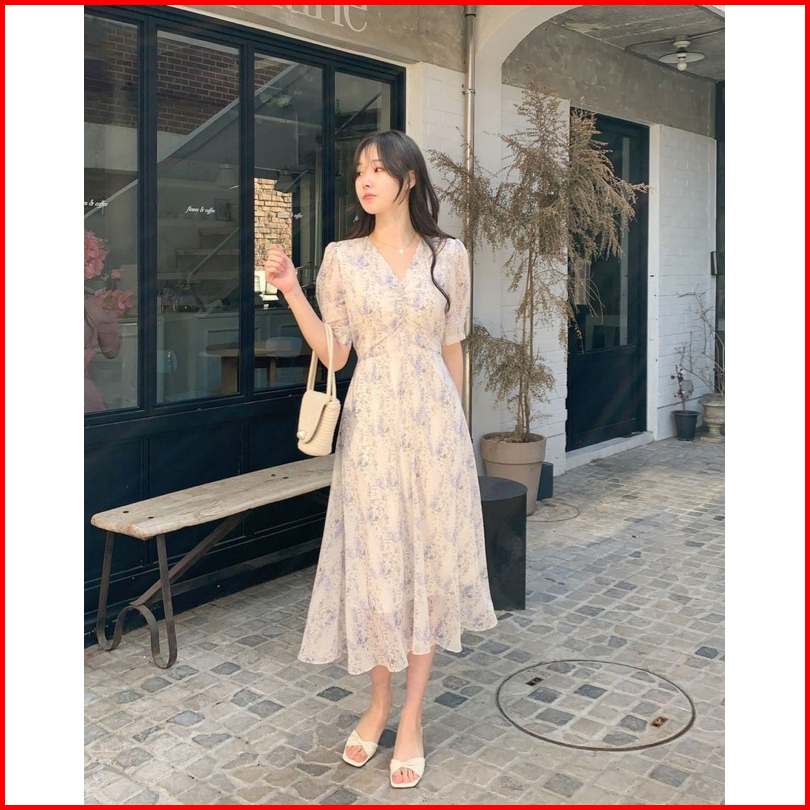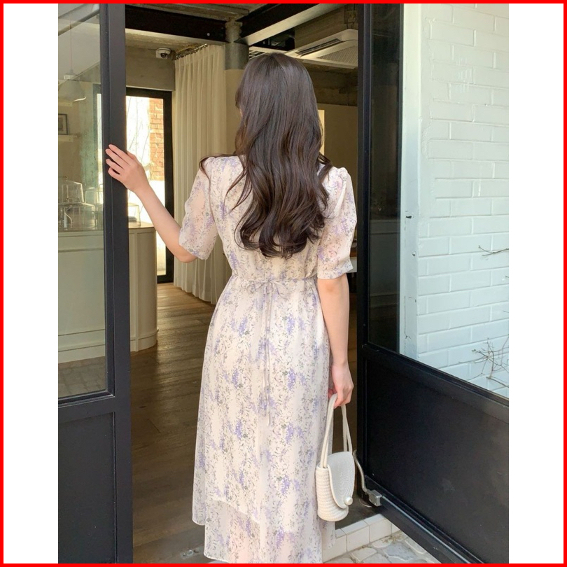 Marisol Dress Floral Vintage Korean Summer Casual Sweet Street Holiday Midi Kerut Pastel Lilac White Pink Flower Beach R