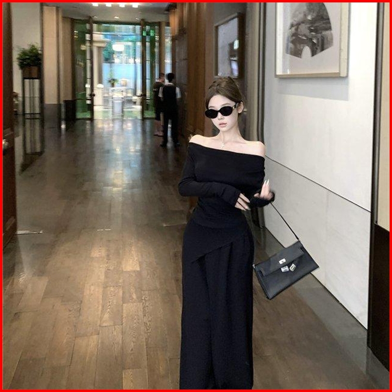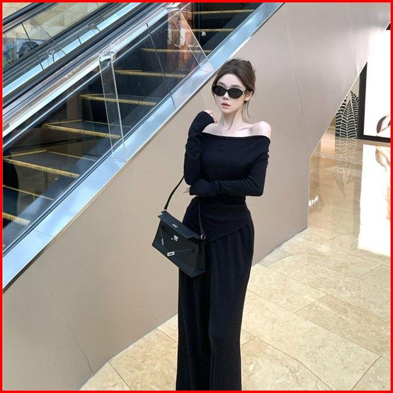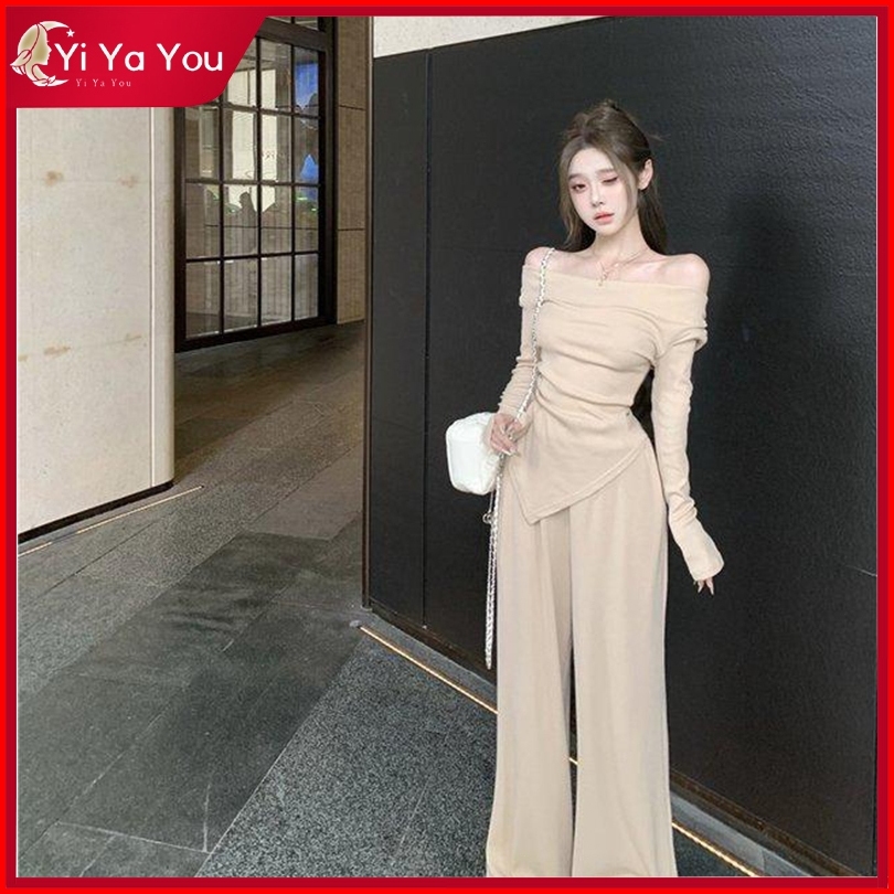 Yi Ya You - Setelan Baju Dewasa Knit Rajut Halus Setelan Off Shoulder Sabrina Top Gaya Santai Setelan Celana - Kemeja