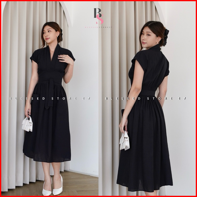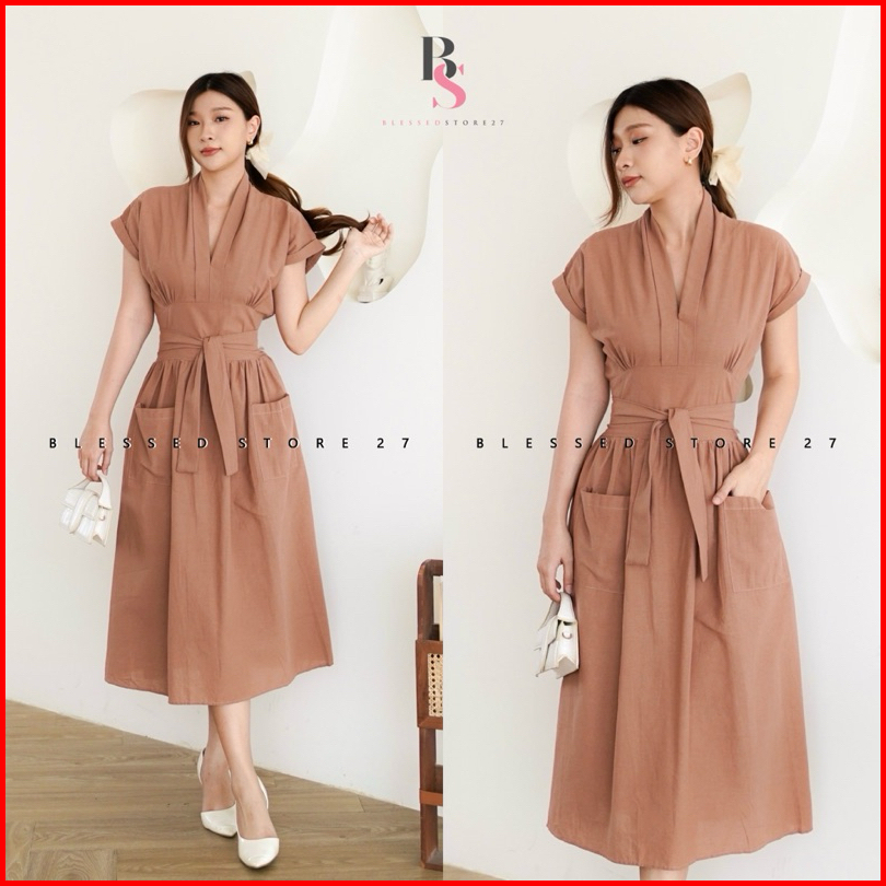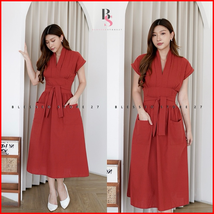 D1652 Aroana Korean Style Vintage Midi Dress Simple Polos Vneck Ramping Kasual Formal Look Christmas Natal Pesta Dinner