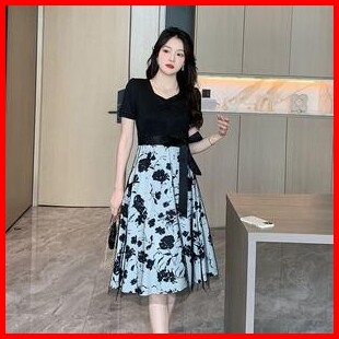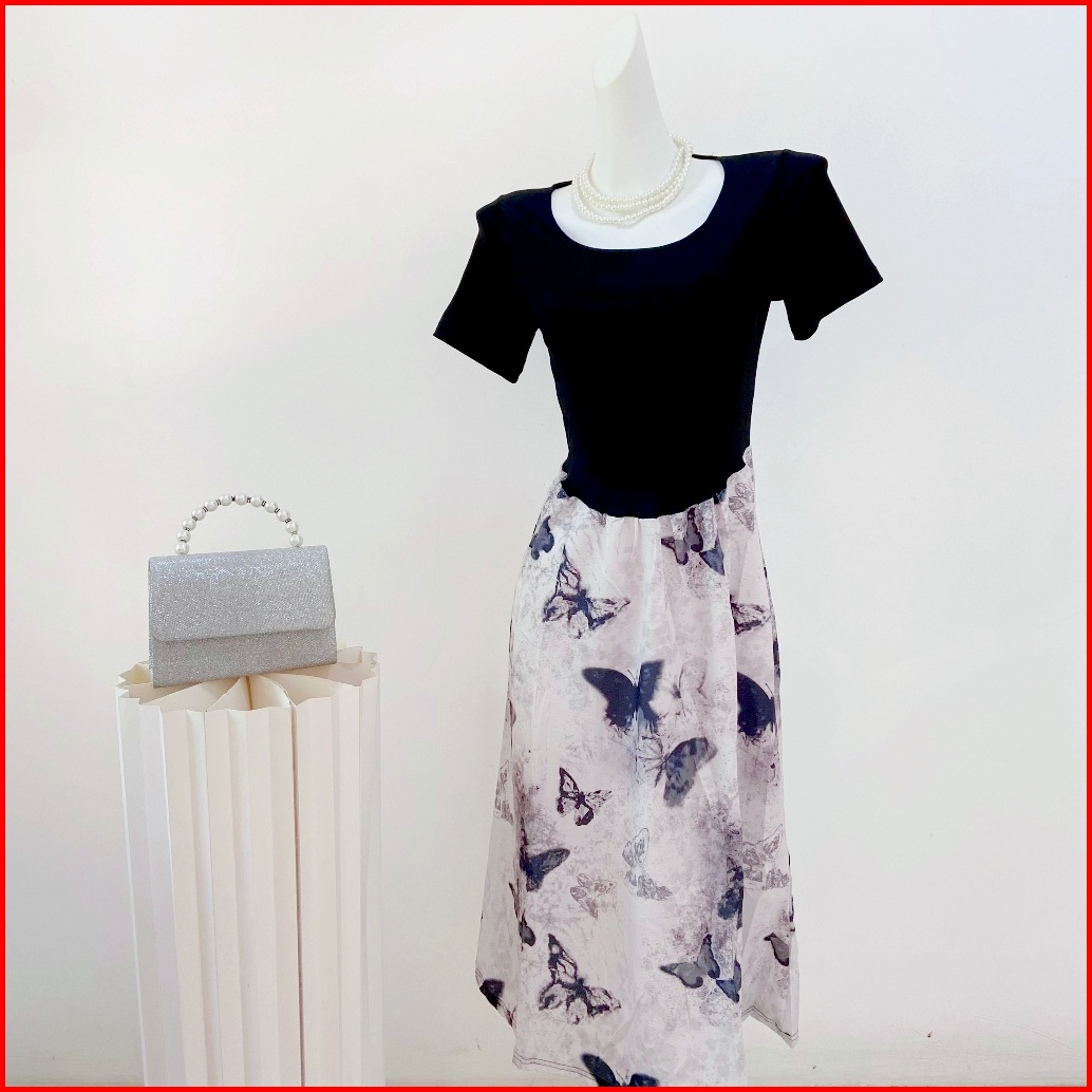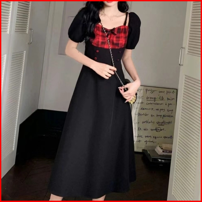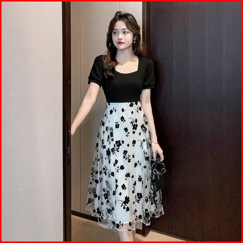 Baju Midi Dress Terbaru Lebaran 2025 Dress Hitam Floral Korean Elegant A-line Dress Bodycon Lengan Pendek Dress Formal B