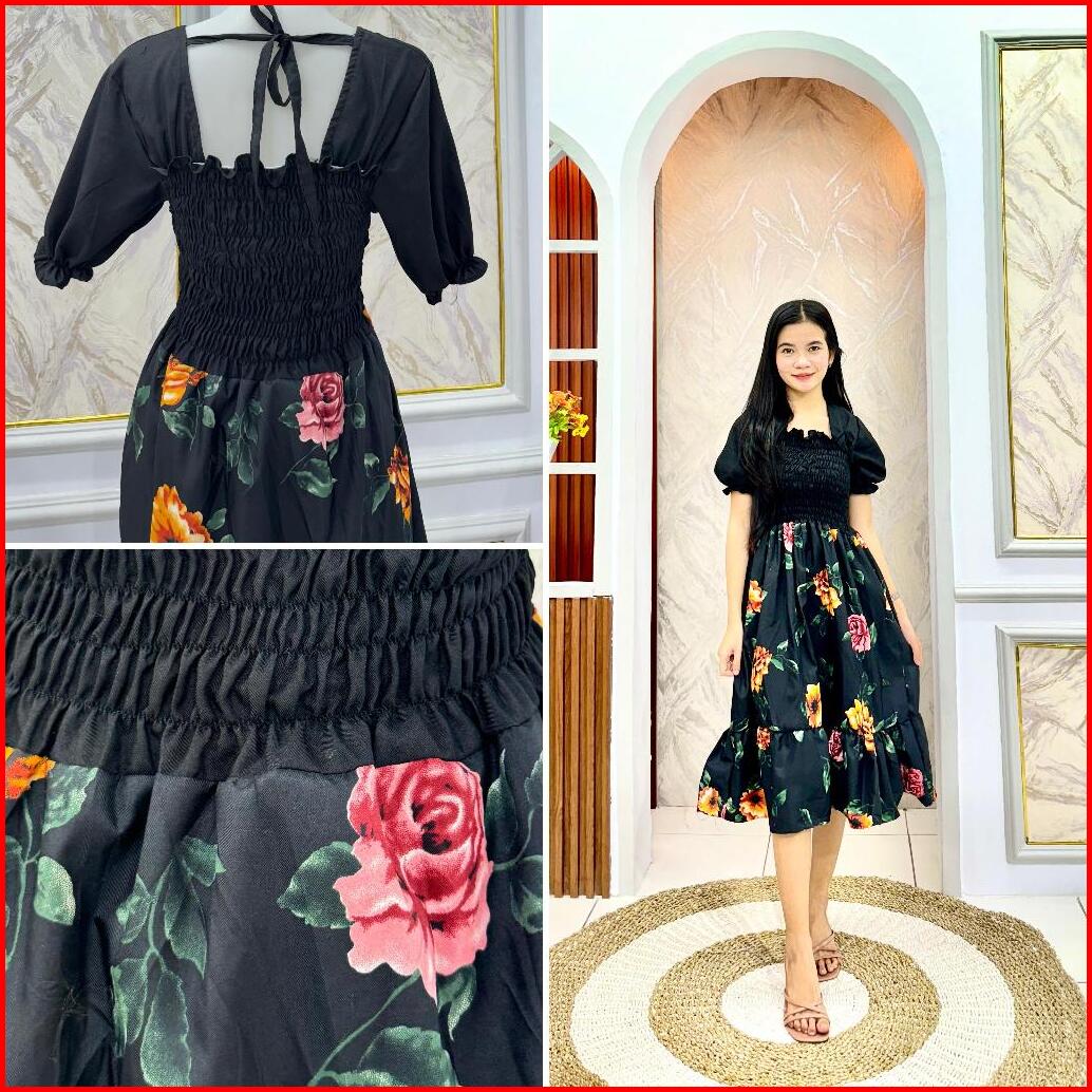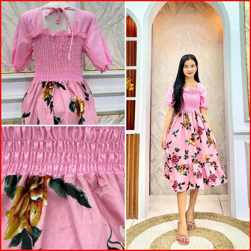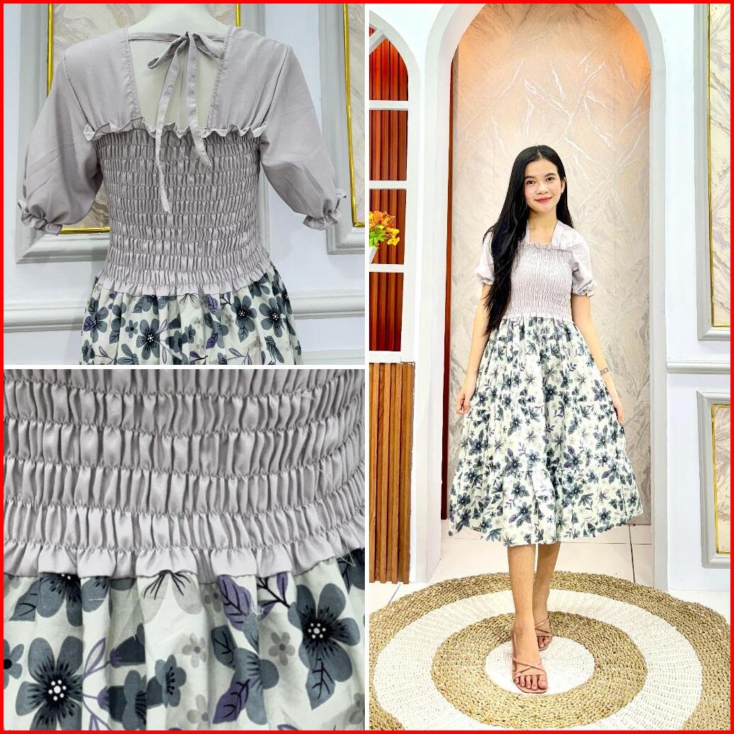 Jiwon Dress Combinasi Gaun Musim Panas Kasual Baru Lengan Pendek Smocked Dress Lipit Bunga Dengan Dasi
