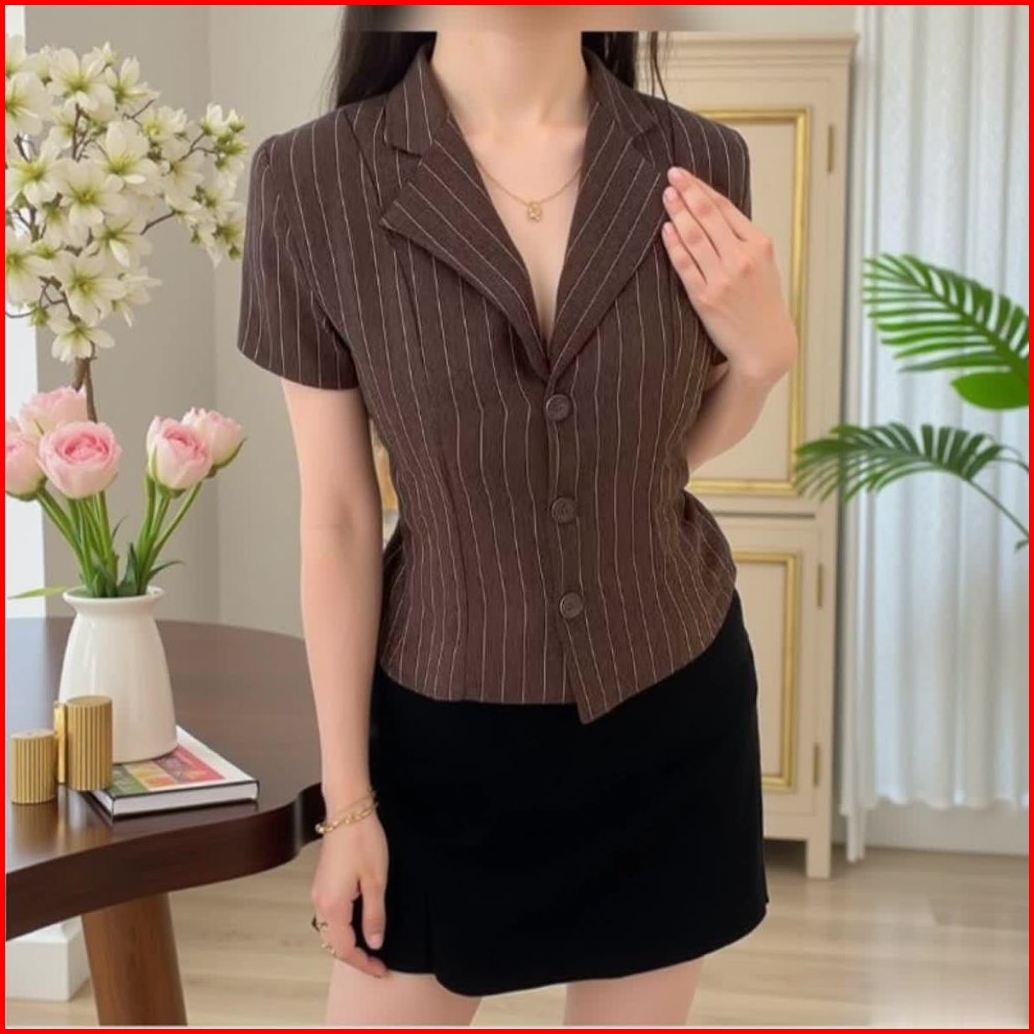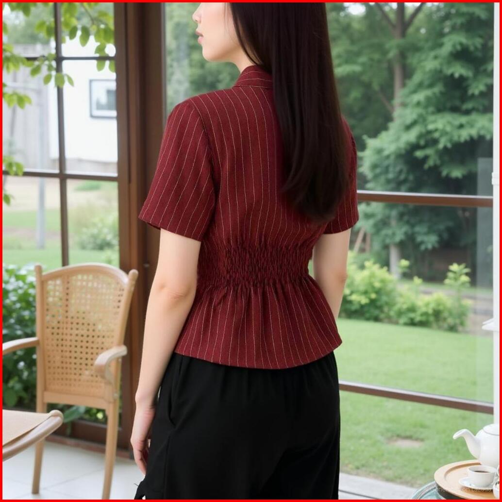 Kemeja Tangan Pendek Semiwoll - Atasan Kemeja Salur Stripe Wanita V Neck Lengan Pendek