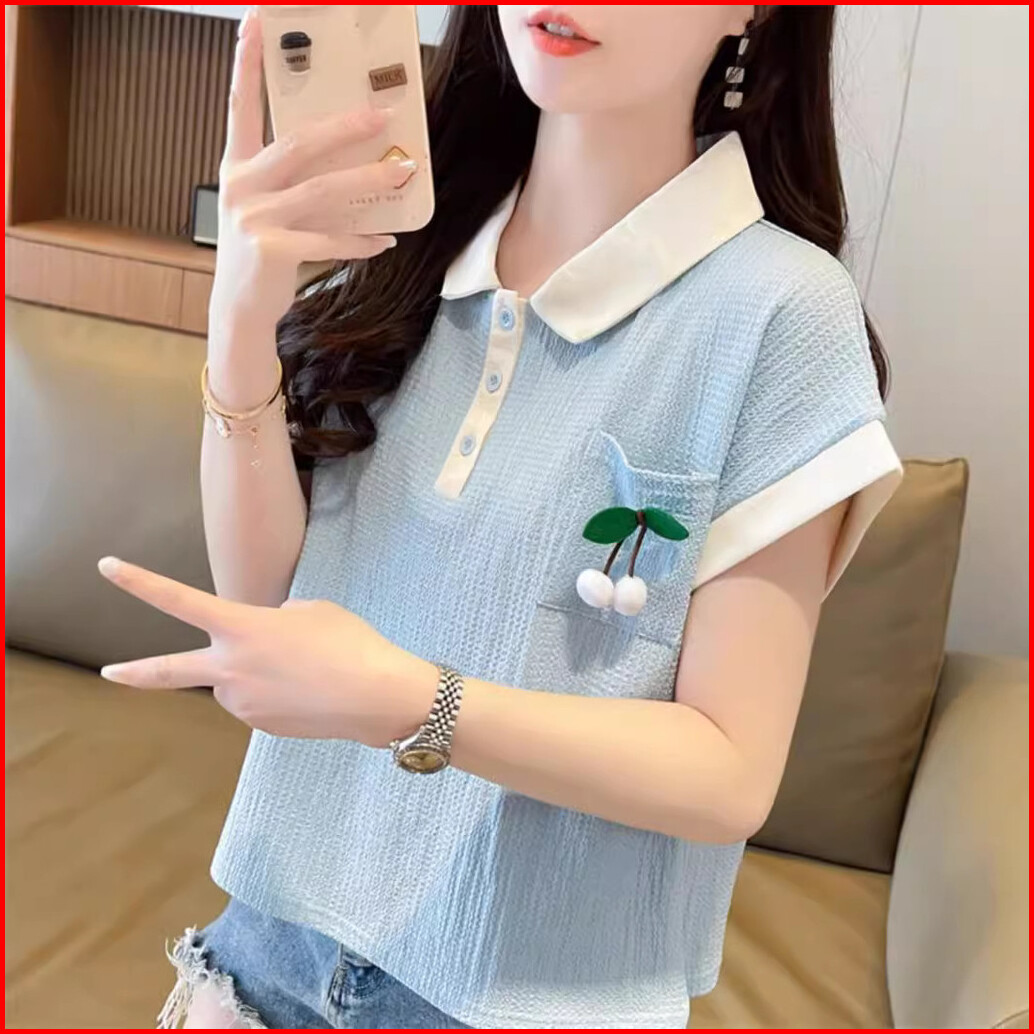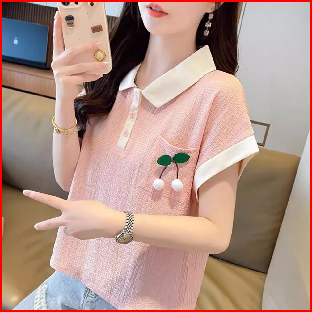 Atasan Wanita Dewasa Kerah Kancing Cerry Saku Lengan Pendek Gaya Baru