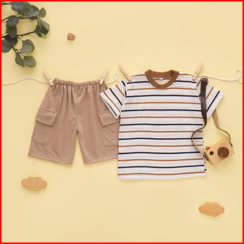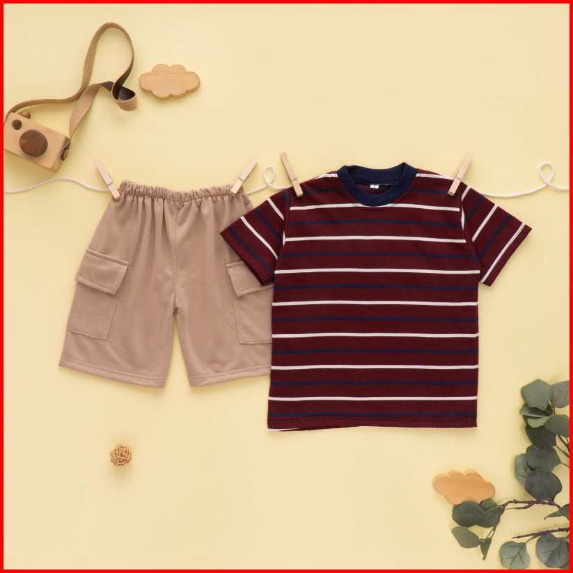 Setelan Anak Kaos Salur Stripe Dan Celana Cargo Usia 1-5 Tahun