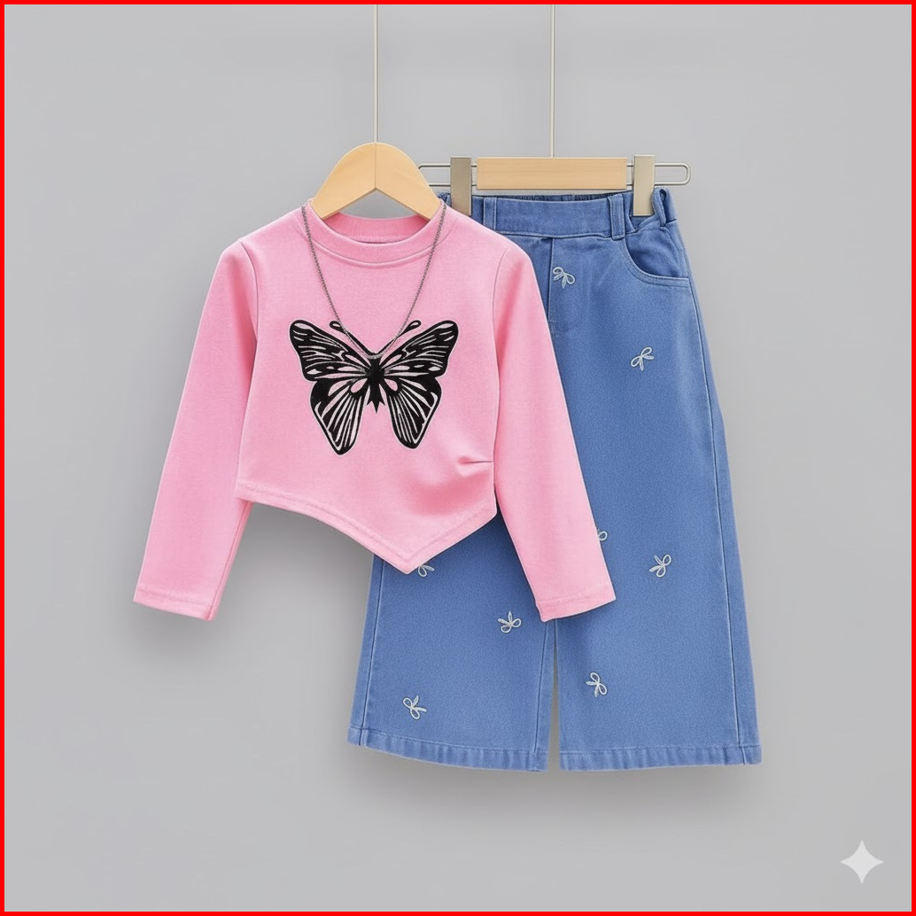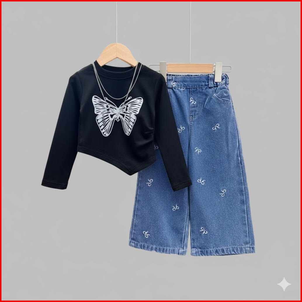 Babysupersuper Setelan Anak Perempuan Kaos Crop Kupu Dan Celana Denim Panjang Pita Untuk Anak 1-5 Tahun Terbaru Termurah