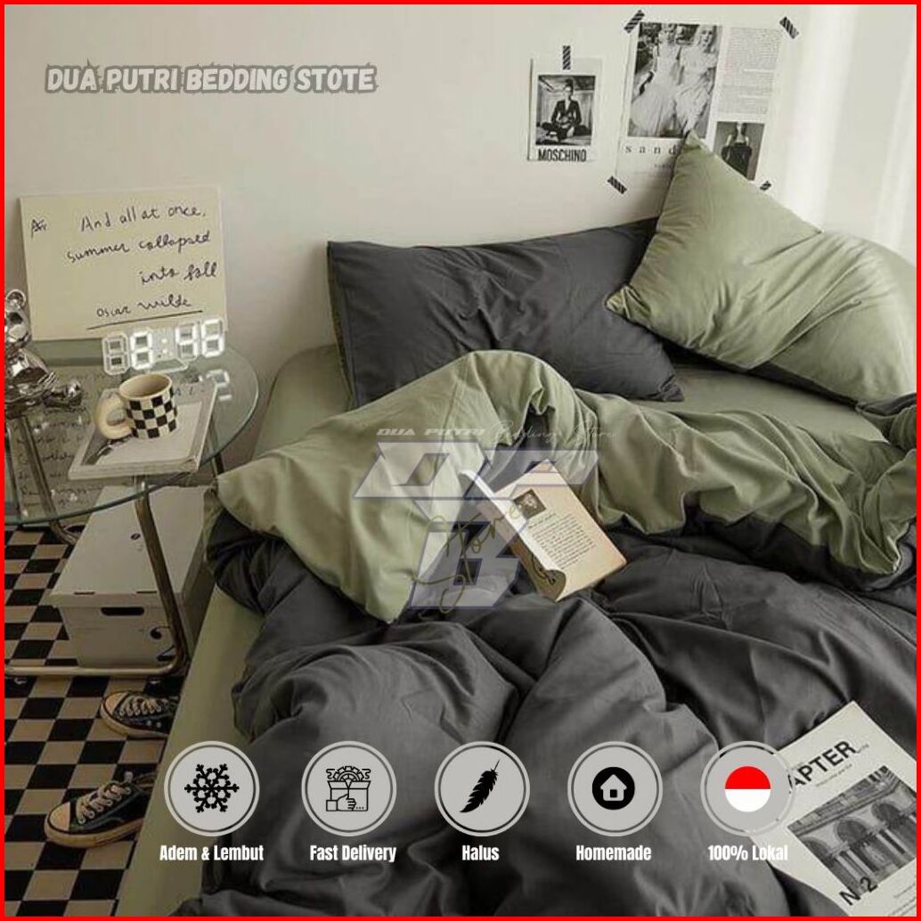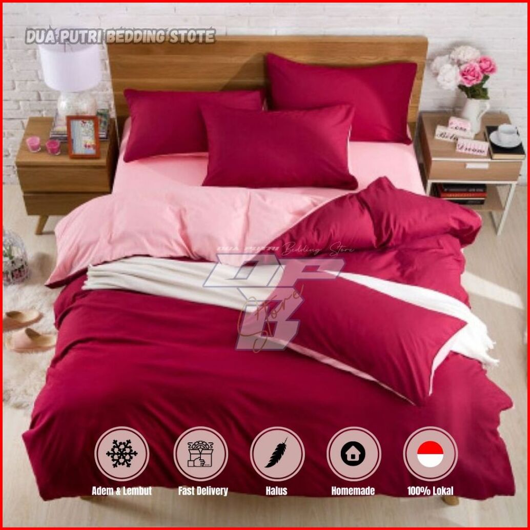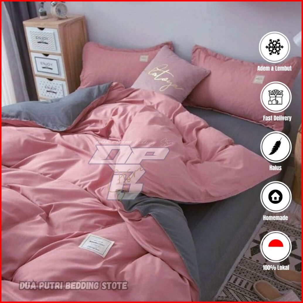 Bedcover Set Motif Kombinasi Pink Polos Abu Polos- Single Queen King Size
