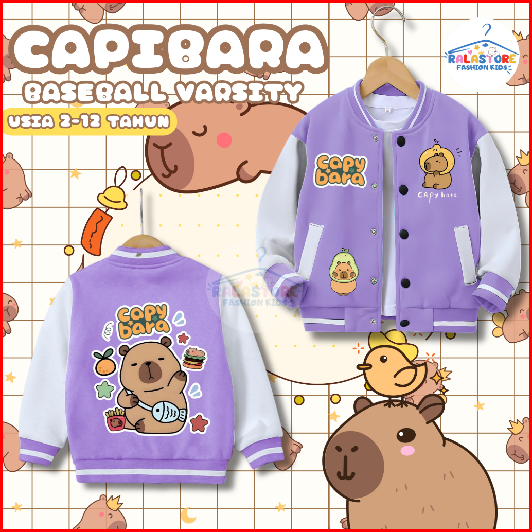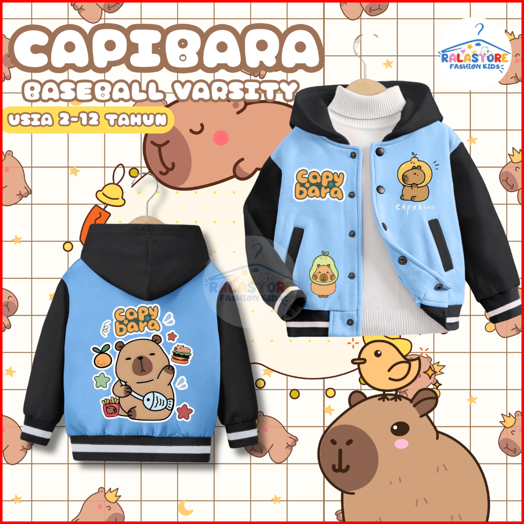 Jaket Capybara Varsity Baseball Hoodie Laki-laki Perempuan Usia 2-12 Tahun Bahan Premium Fleece