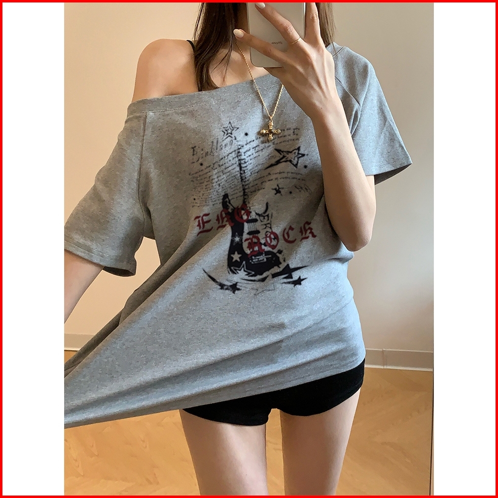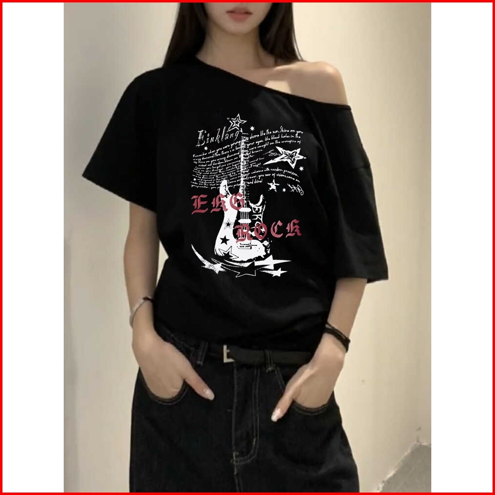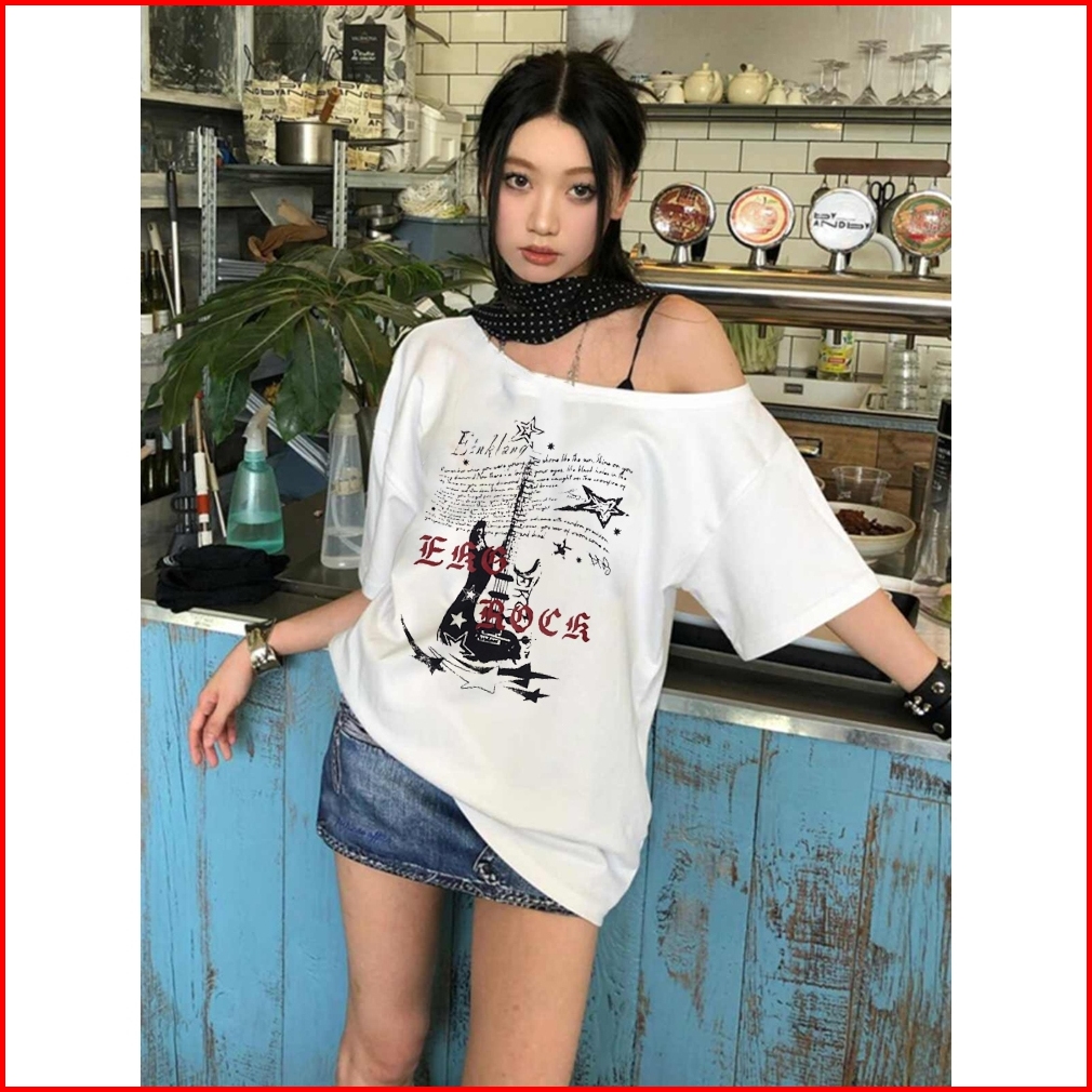 2toyoung Band Rock 24s Katun Sisir Y2k Tee Retro Acleanfit T-shirt Bahu Miring Oversize Kaos Atasan Wanita Kekinian