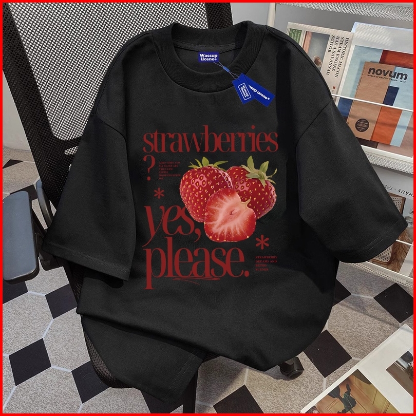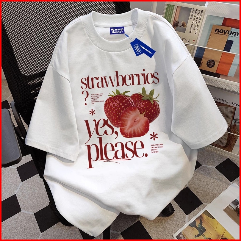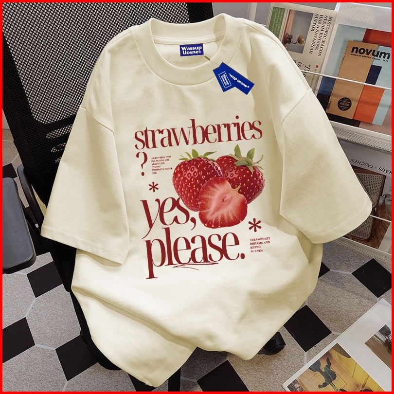 Boombap Korean Style T-shirt Oversize Please Eat Strawberry Print Top Kaos Wanita Cream Kaos Pria Dan Wanita Street Styl